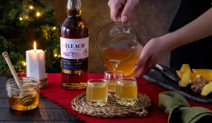Recept Uppfriskande vitvinsglögg med whiskytwist Fruktigt vitt vin, solmogen citrus, ingefära och
